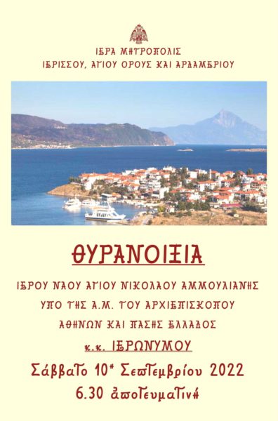 Παρουσία του Μακαριωτάτου Αρχιεπίσκοπου Αθηνών και πάσης Ελλάδος κ.κ. Ιερωνύμου θα πραγματοποιηθούν αύριο, Σάββατο 10 Σεπτεμβρίου, τα θυρανοίξια του Ιερού Ναού Αγίου Νικολάου Αμμουλιανής της Ιεράς Μητροπόλεως Ιερισσού, Αγίου Όρους και Αρδαμερίου.