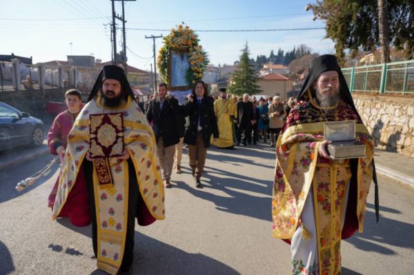Μετά το πέρας της Θείας Λειτουργίας εψάλη Δοξολογία επί τη Πρώτη του Νέου Έτους, ευλογήθηκε και κόπηκε η Αγιοβασιλόπιτα από τον Σεβασμιώτατο και όλους τους Άρχοντες του Τόπου και επακολούθησε μεγάλη Λιτανεία της Θαυματουργού Εικόνος και του Ιερού Λειψάνου του Αγίου ανά τις οδούς της Μ. Παναγίας, επ΄ ευλογία του λαού της και του Τόπου, που είναι οι τετιμημένοι απόγονοι της Αρχαίας Ρεβενίκιας.