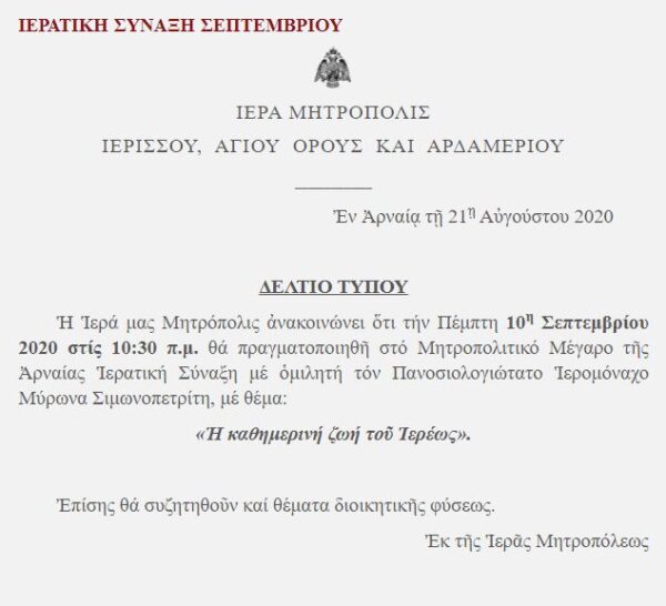 ΙΕΡΑ ΜΗΤΡΟΠΟΛΗ ΙΕΡΙΣΣΟΥ, ΑΓΙΟΥ ΟΡΟΥΣ ΚΑΙ ΑΡΔΑΜΕΡΙΟΥ – Την Πέμπτη 10 Σεπτεμβρίου 2020 και ώρα 10:30 π.μ. θα πραγματοποιηθεί στο Μητροπολιτικό Μέγαρο της Αρναίας Ιερατική Σύναξη με ομιλητή τον Πανοσιολογιώτατο Ιερομόναχο Μύρωνα Σιμωνοπετρίτη, με θέμα: «Η καθημερινή ζωή του Ιερέως».
