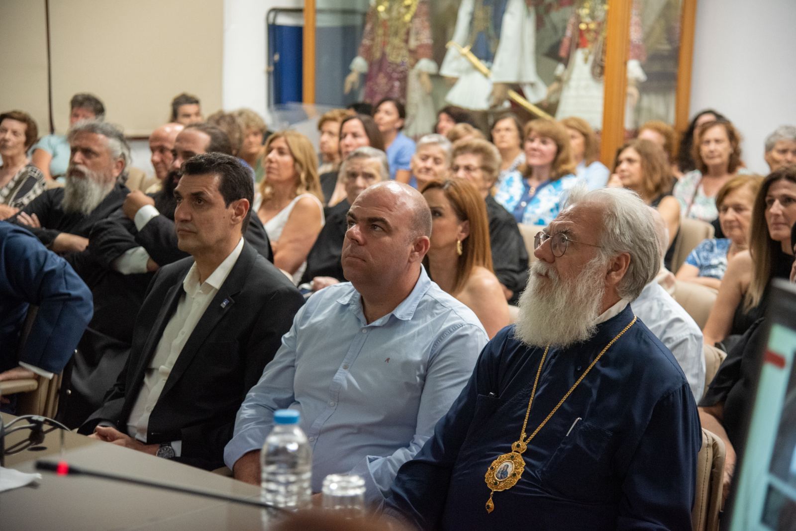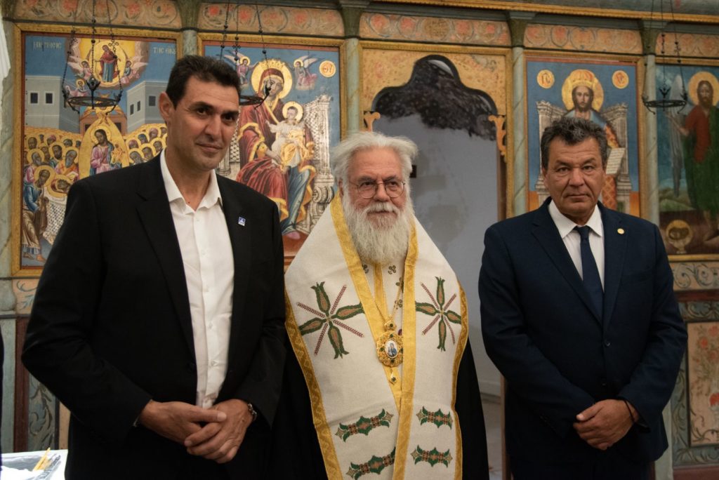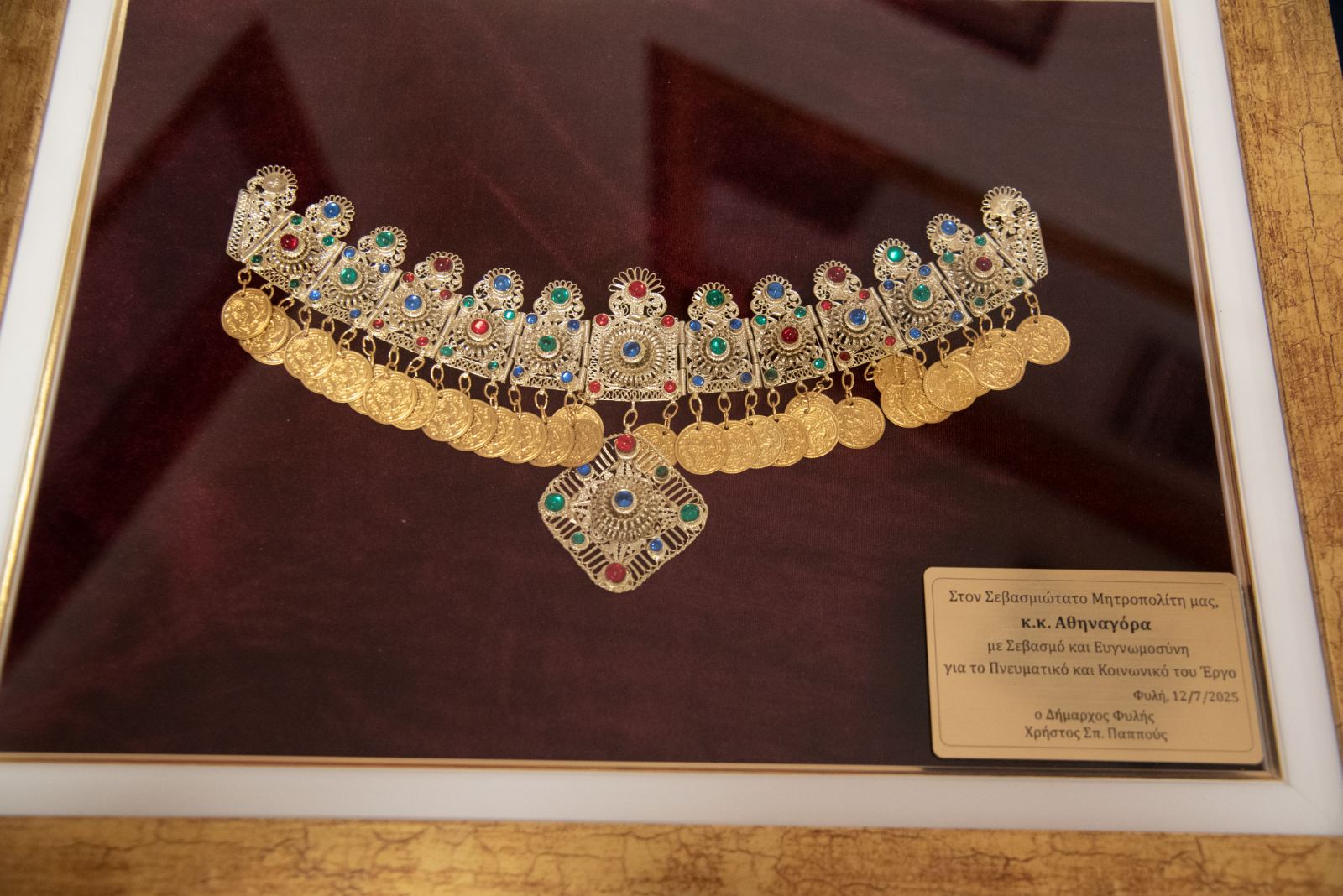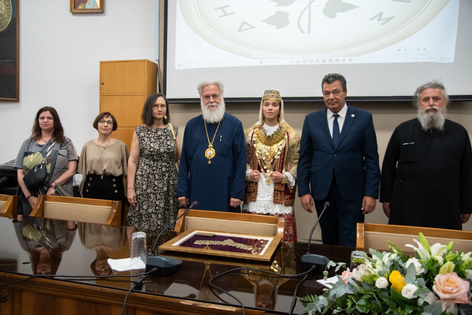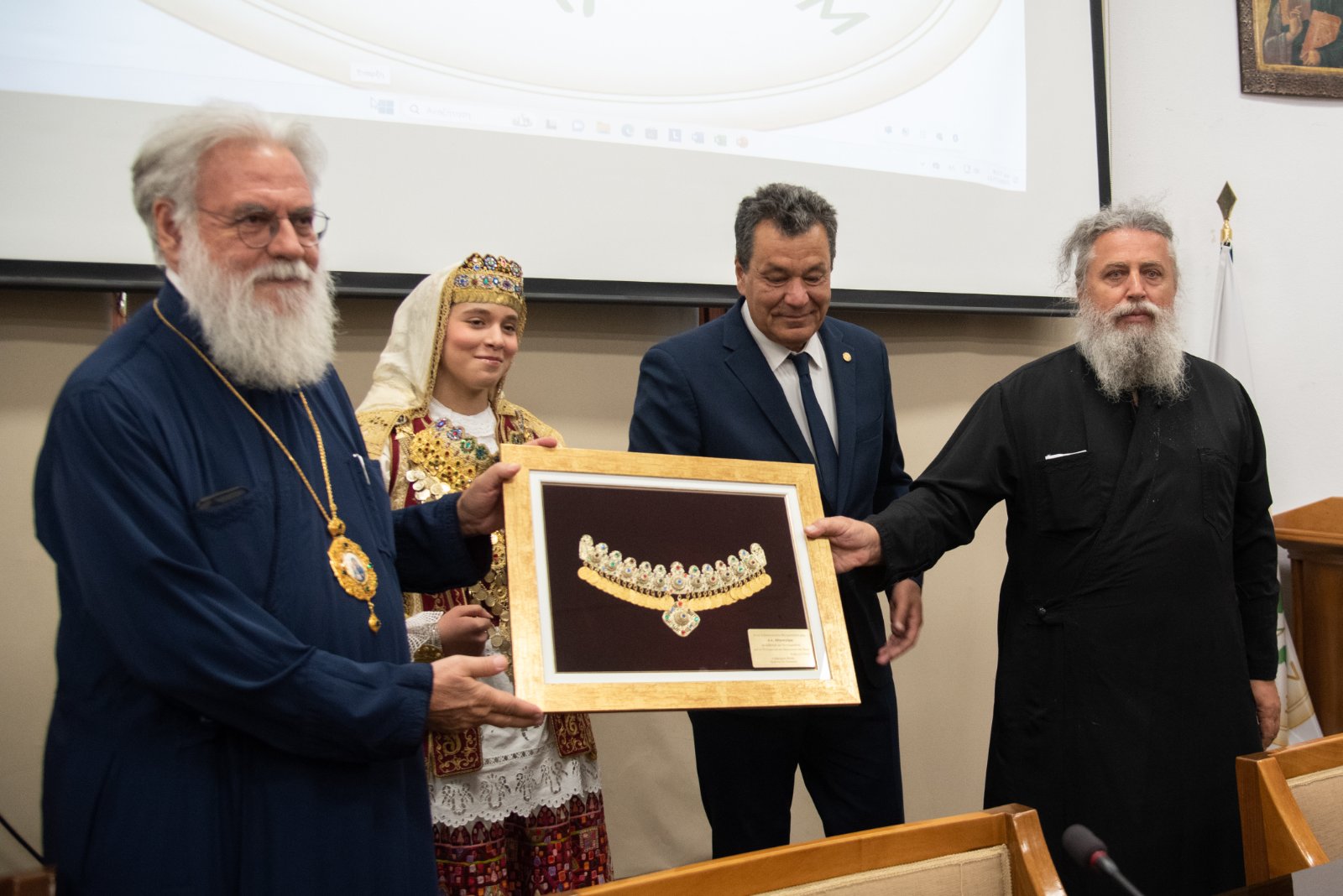 Μετά το τέλος των εισηγήσεων ο κ. Δήμαρχος επέδωσε στον Σεβασμιώτατε κάδρο που περιείχε αυθεντικό «γιορτάνι», ο οποίος το επέδωσε με την σειρά του στον π. Δημήτριο, επειδή κοπίασε πολύ κατά τα χρόνια υλοποιήσεως του έργου (2018-2023).
