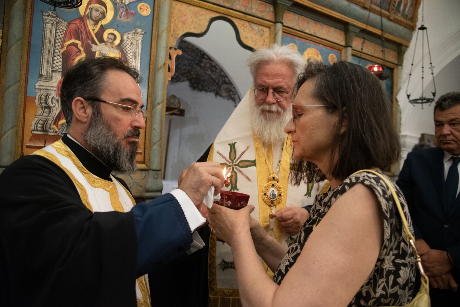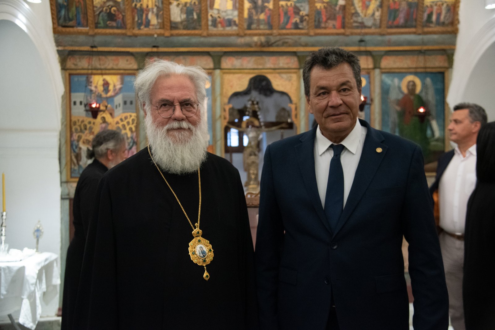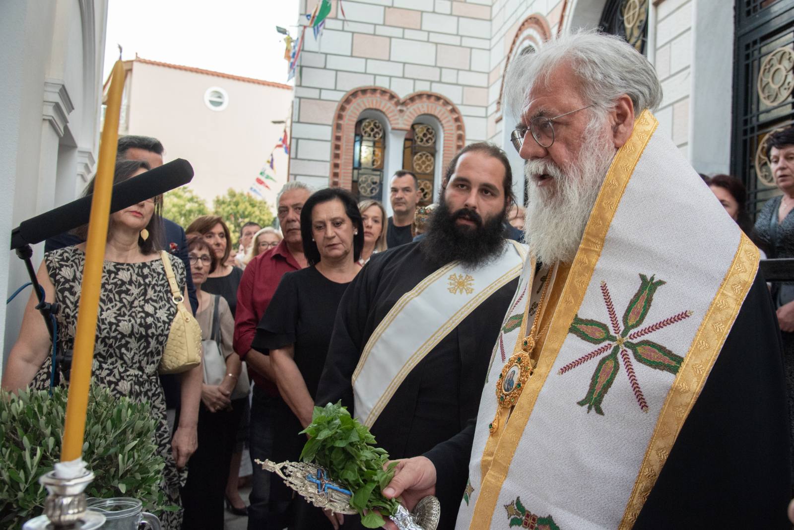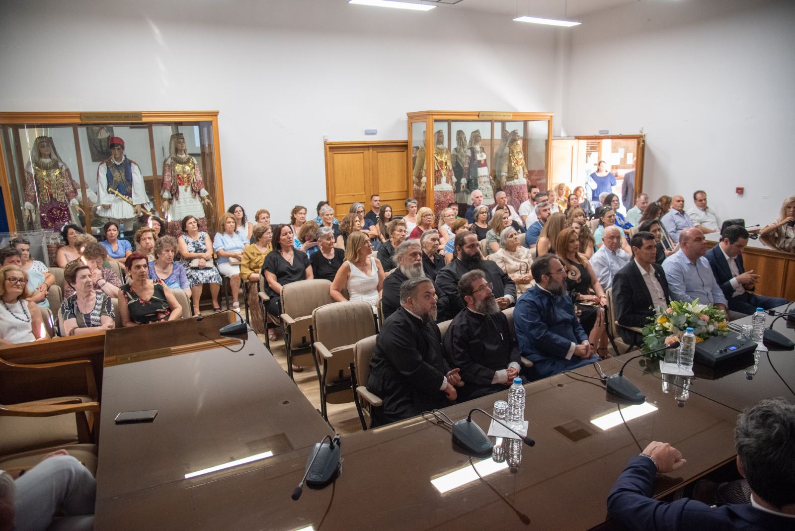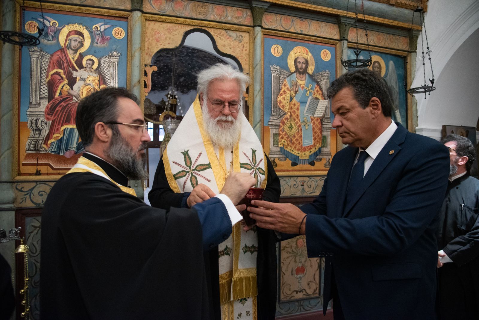 Μετά το τέλος των εισηγήσεων ο κ. Δήμαρχος επέδωσε στον Σεβασμιώτατε κάδρο που περιείχε αυθεντικό «γιορτάνι», ο οποίος το επέδωσε με την σειρά του στον π. Δημήτριο, επειδή κοπίασε πολύ κατά τα χρόνια υλοποιήσεως του έργου (2018-2023).
