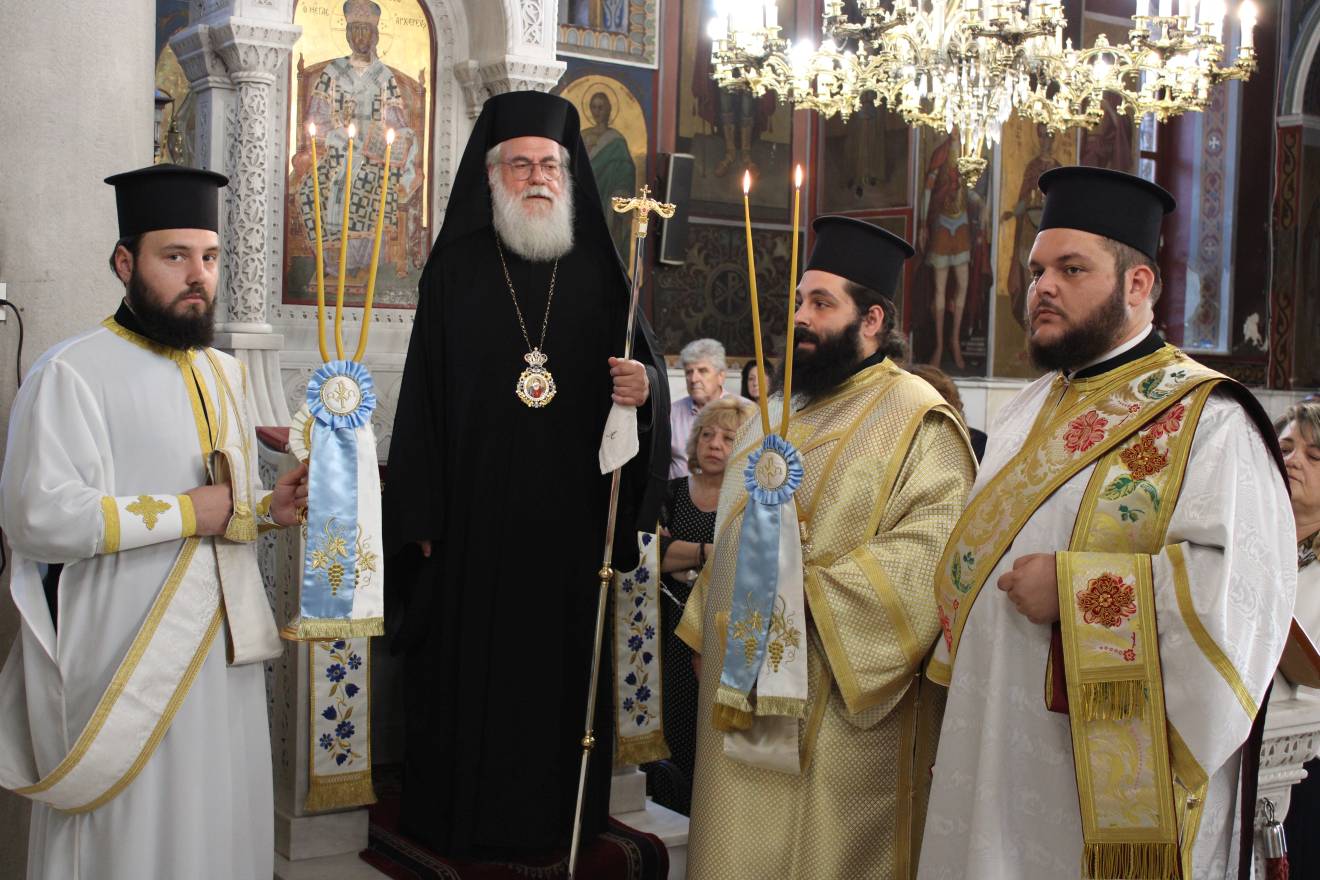 Ήταν συμπαραστατούμενος από τους Αρχιμανδρίτες Ιωάννη Ράπτη – Γενικό Αρχιερατικό της Ιεράς Μητροπόλεως, Αγαθάγγελο Κόκλα – Ιεροκήρυκα, Χρυσόστομο Καλαθά – Πρόεδρο του Εκκλ. Συμβουλίου του Ιερού Ναού Αγίου Διονυσίου Αχαρνών, Μιχαήλ Γιαννακέλο – Πρόεδρο του Εκκλ. Συμβουλίου του Ιερού Ναού, τους συνεφημερίους του π. Γεώργιο Χαλκιά και π. Μιχαήλ Καρ, τον π. Βασίλειο Πλιάτσικα και τους διακόνους του π. Άγγελο Μιχαλόπουλο, π. Νεκτάριο Τριβέλλα και π. Καλλίνικο Ζωγράφο.