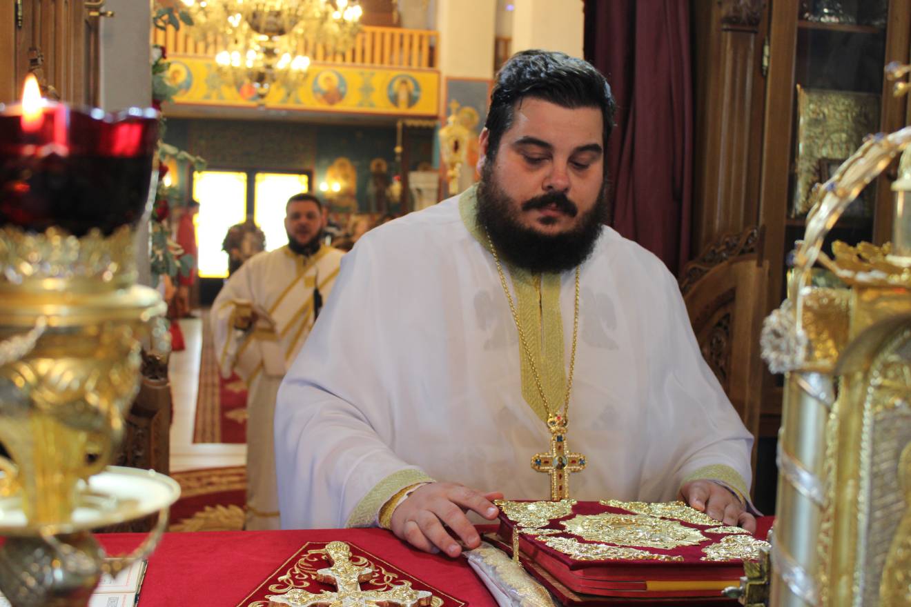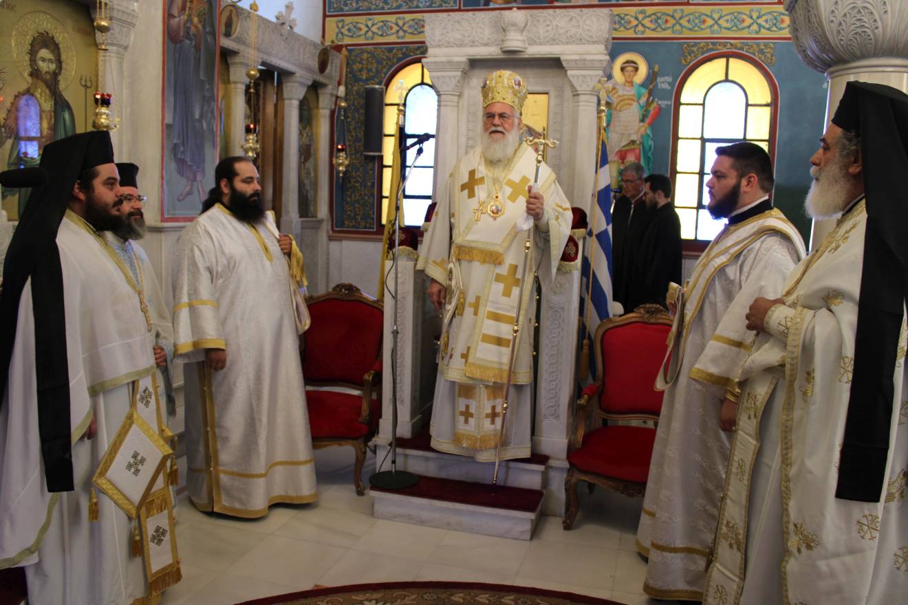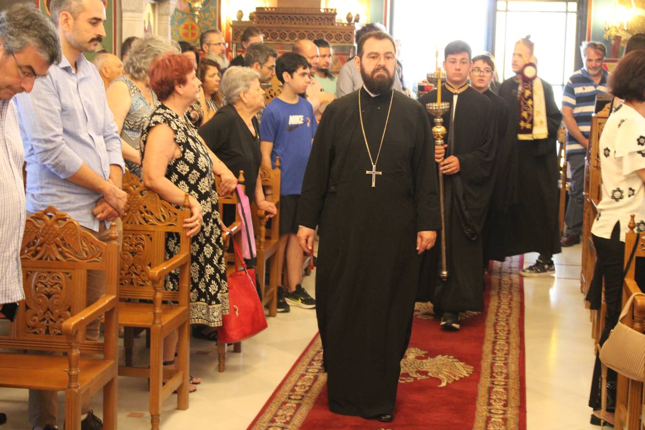…συμπαραστατούμενος από τους Αρχιμανδρίτες Ιωάννη Ράπτη – Γενικό Αρχιερατικό Επίτροπο της Ιεράς Μητροπόλεως, Ιάκωβο Γιοσάκη – Πρόεδρο του Εκκλ. Συμβουλίου του Ιερού Ναού, Χρυσόστομο Καλαθά – Πρόεδρο του Εκκλ. Συμβουλίου του Ιερού Ναού Αγίου Διονυσίου Αχαρνών, Μιχαήλ Γιαννακέλο – Πρόεδρο του Εκκλ. Συμβουλίου του Ιερού Ναού Κοιμήσεως της Θεοτόκου Αχαρνών και τους διακόνους του π. Άγγελο Μιχαλόπουλο και π. Καλλίνικο Ζωγράφο.