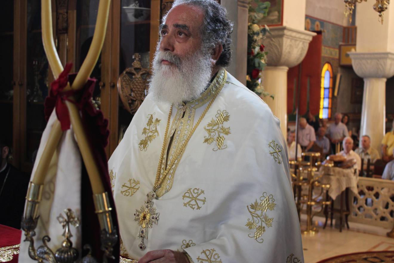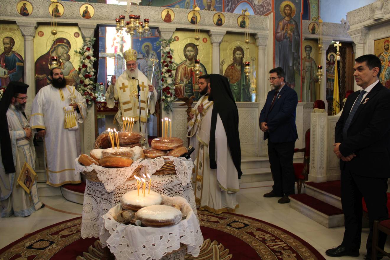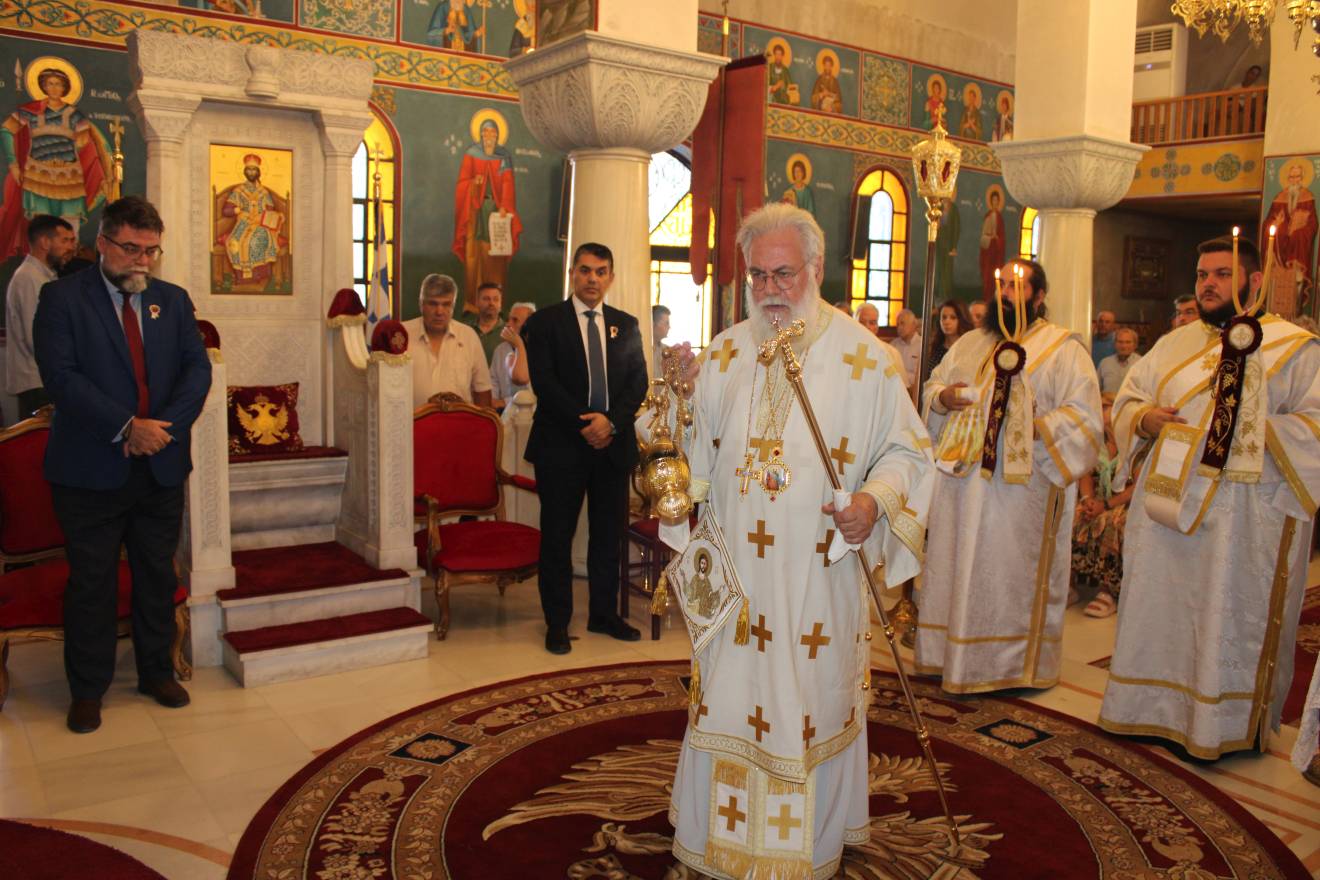 …συμπαραστατούμενος από τους Αρχιμανδρίτες Ιωάννη Ράπτη – Γενικό Αρχιερατικό Επίτροπο της Ιεράς Μητροπόλεως, Ιάκωβο Γιοσάκη – Πρόεδρο του Εκκλ. Συμβουλίου του Ιερού Ναού, Χρυσόστομο Καλαθά – Πρόεδρο του Εκκλ. Συμβουλίου του Ιερού Ναού Αγίου Διονυσίου Αχαρνών, Μιχαήλ Γιαννακέλο – Πρόεδρο του Εκκλ. Συμβουλίου του Ιερού Ναού Κοιμήσεως της Θεοτόκου Αχαρνών και τους διακόνους του π. Άγγελο Μιχαλόπουλο και π. Καλλίνικο Ζωγράφο.