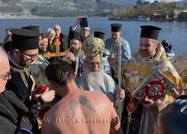 Στο τέλος της αρχιερατικής Θείας Λειτουργίας, ο Σεβασμιώτατος Μητροπολίτης κ. Ιγνάτιος τέλεσε την ακολουθία του Μεγάλου Αγιασμού των Θεοφανείων και στην συνέχεια κλήρος και λαός εν πομπή, με την συνοδεία της φιλαρμονικής της 8ης Μεραρχίας και αυτής του Δήμου Ιωαννιτών, μετέβησαν στην παρά την λίμνη Παμβώτιδα Πλατεία Μαβίλη, όπου έγινε ο καθαγιασμός των υδάτων και τον οποίο παρακολούθησε πλήθος πιστών. Στα παγωμένα νερά έπεσαν και φέτος τηρώντας το πατροπαράδοτο έθιμο αρκετοί νέοι στους οποίους ο Σεβασμιώτατος Μητροπολίτης κ. Ιγνάτιος ενεχείρισε ως ευλογία επιστήθιους Σταυρούς.