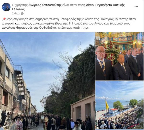 Σε ανάρτηση του ο Υφυπουργός Εξωτερικών Ανδρέας Κατσανιώτης δηλώνει: “Ιερή συγκίνηση στη σημερινή τελετή μεταφοράς της εικόνας της Παναγίας Τρυπητής στην ιστορική και πλήρως ανακαινισμένη έδρα της. Η Πολιούχος του Αιγίου και ένας από τους μεγάλους θησαυρούς της Ορθοδοξίας, επέστεψε «σπίτι της».