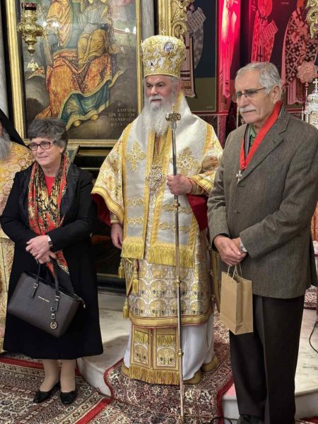 Λίγο πριν από το τέλος, ο Σεβασμιώτατος επεφύλαξε μία σπουδαία και μεγάλη έκπληξη κατά την ημέρα αυτή των Γραμμάτων και της Παιδείας στον συνταξιούχο Εκπαιδευτικό (Θεολόγο και Φιλόλογο) κ. Παναγιώτη Αχιλλιά, τιμώντας τον και απονέμοντάς του τον Χρυσό Σταυρό της Ιεράς Μητροπόλεώς μας για το πολυετές και ευδόκιμο εκπαιδευτικό του έργο, αλλά και για την ευλαβή τριακονταετή διακονία του στο Ιερό Αναλόγιο του Μητροπολιτικού Ιερού Ναού και την προσφορά του στην τοπική μας Εκκλησία τόσο κατά την περίοδο του Σεπτού Προκατόχου του, Σεβασμιωτάτου Μητροπολίτου πρ. Καλαβρύτων και Αιγιαλείας κ. Αμβροσίου, όσο και επί των ημερών του.