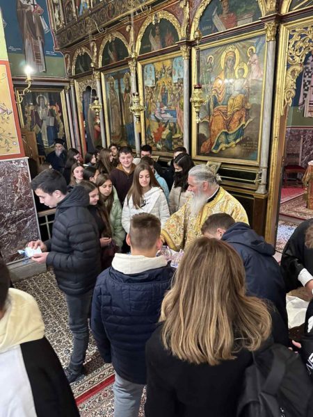 Στη σύντομη πρόσρησή του, ο Σεβασμιώτατος Μητροπολίτης μας κ. Ιερώνυμος συνεχάρη τους εκπαιδευτικούς και τους μαθητές για τη συμμετοχή τους στον εορτασμό των Τριών Ιεραρχών και Διδασκάλων της Εκκλησίας μας, καθώς και για την προετοιμασία τους να συμμετάσχουν στη Θεία Μετάληψη και τους ευχήθηκε να έχουν τον θείο φωτισμό και την προστασία των Τριών Ιεραρχών προς ευόδωση του απαιτητικού τους έργου.