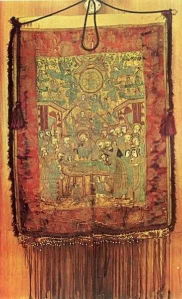 Στο κάτω μέρος του, τοποθετήθηκαν κρεμαστά, χρυσοκέντητα κρόσσια. Τέλος κρεμάστηκε σε κοντάρι, από καλοδουλεμένο ακριβό ξύλο, την κορυφή του οποίου κοσμούσε σταυρός.