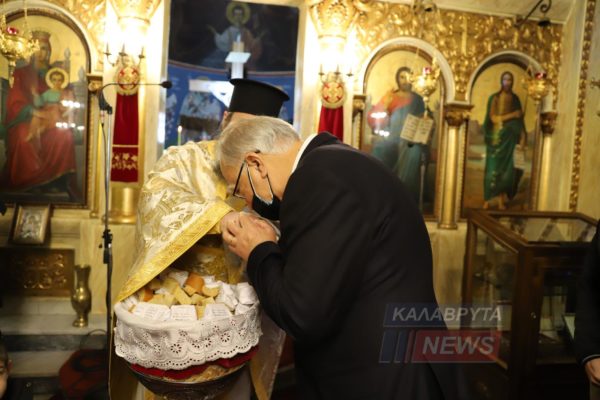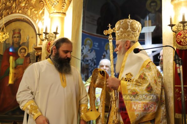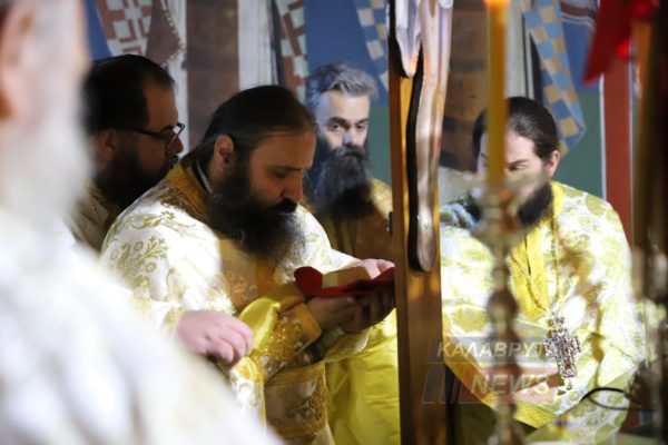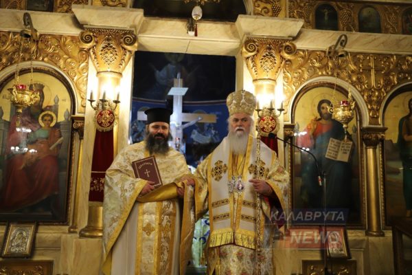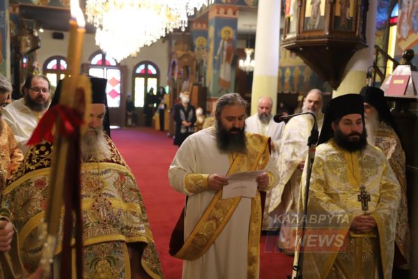 Τον Σεβασμιώτατο πλαισίωναν ο Καθηγούμενος της Ιεράς Μονής Μεγάλου Σπηλαίου, Αρχιμανδρίτης π. Καλλίνικος, ο Καθηγούμενος της Ιεράς Μονής Αγίας Λαύρας, Αρχιμανδρίτης π. Ευσέβιος, ιερείς και διάκονοι της τοπικής Εκκλησίας.