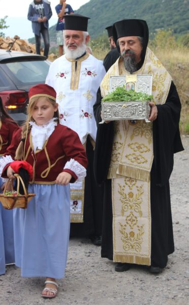 Εν συνεχεία σχηματίστηκε λιτανευτική πομπή, προς τον εορτάζοντα Ιερό Ναό Αγίου Νεκταρίου, με τα παιδιά του κατηχητικού Σχολείου, να συνοδεύουν τη πομπή φορώντας παραδοσιακές φορεσιές, όπου κι εψάλη Πανηγυρικός Αρχιερατικός Εσπερινός μετά αρτοκλασίας και ακολούθησε Ιερή Παράκληση στους Νεοφανείς Αγίους Ραφαήλ, Νικόλαο και Ειρήνη.