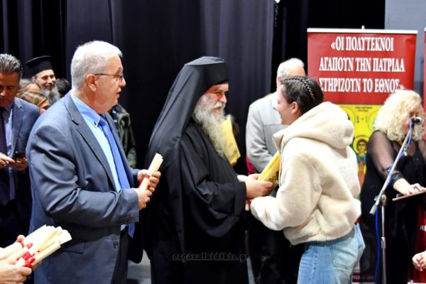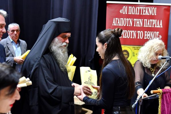 Μετά την κοπή της πρωτοχρονιάτικης πίτας του Συλλόγου πραγματοποιήθηκε η απονομή τιμητικών διακρίσεων από τον Ιερομόναχο Γεώργιο Βατοπαιδινό. Πρόκειται για μια πράξη της Ιεράς Μονής με την οποία στηρίζει την πολύτεκνη οικογένεια σε μια δύσκολη εποχή για το θεσμό της οικογένειας και μάλιστα της πολύτεκνης. Ο π. Γεώργιος ανέγνωσε το μήνυμα του Γέροντα Εφραίμ και της Βατοπαιδινής αδελφότητας, μεταφέροντας την ευλογία και τη χάρη της προστάτιδος της Μονής Κυρίας Θεοτόκου και της χαριτοβρύτου αυτής Τιμίας Ζώνης και ενθαρρύνοντας τους πολυτέκνους στον αγώνα και τη προσπάθειά τους να κρατήσουν ζωντανά την πίστη και τον αγώνα τους. Τα βραβεία που δόθηκαν από την Ιερά Μονή Βατοπεδίου συνοδεύτηκαν από χρηματικό έπαθλο ανάλογο με την κατηγορία στην οποία άνηκε ο κάθε βραβευθείς.