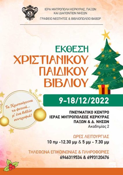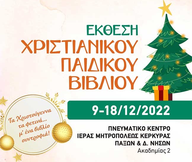 “Τα Χριστούγεννα τα φετινά… με ένα βιβλίο αγκαλιά”, με αυτό το μήνυμα η Ιερά Μητρόπολη Κερκύρας και Διαποντίων Νήσων διοργανώνει Έκθεση Χριστιανικού Παιδικού Βιβλίου. Η Έκθεση θα πραγματοποιηθεί στο Πνευματικό Κέντρο της Ιεράς Μητροπόλεως την Παρασκευή 9 Δεκεμβρίου και θα διαρκέσει έως τις 18 Δεκεμβρίου 2022.