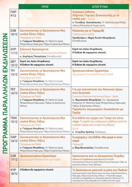 Το Σάββατο 17 Δεκεμβρίου 2022 η Σχολή Εκκλησιαστικής Μουσικής της Ιεράς Μητροπόλεως Κερκύρας ” Αγιος Αρσένιος” θα ψάλει τα Χριστουγεννιάτικα Κάλαντα και την Κυριακή 18 Δεκεμβρίου θα πραγματοποιηθεί η Χριστουγεννιάτικη γιορτή από τα Κατηχητικά Σχολεία της Μητρόπολης στο Αμφιθέατρο του Ιδρύματος Χρονίως Πασχόντων “Η Πλατυτέρα”.