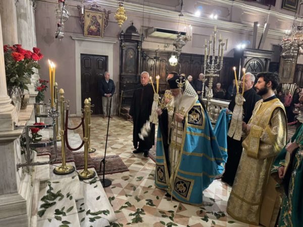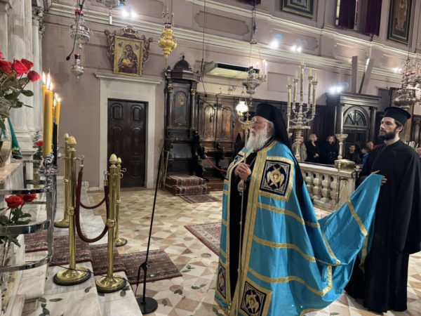 Ο Σεβασμιώτατος απευθυνόμενος στο πυκνό εκκλησίασμα, έλαβε αφορμή από το κουκούλιον του Ακαθίστου Ύμνου το οποίο αναφέρεται στον Δεσπότη Χριστόν, «Ξένον τόκον ἰδόντες, ξενωθῶμεν τοῦ κόσμου, τὸν νοὺν εἰς οὐρανὸν μεταθέντες». Ο Σεβασμιώτατος, αφού εξήγησε στους ανθρώπους σχετικά με το χρονικό της συγγραφής του Ακαθίστου Ύμνου, τόνισε ότι αυτό το ποίημα γράφτηκε σε μία δύσκολη στιγμή για την καμπή της ιστορίας της Κωνσταντινουπόλεως, η οποία χαρακτηρίζεται και ως πόλη της Παναγίας, της Θεοτόκου.