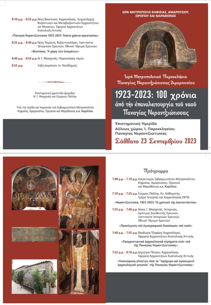 Ημερίδα για τα 100 χρόνια από την επαναλειτουργία του Μητροπολιτικού Παρεκκλησία της Παναγία Νερατζιώτισσας διοργανώνει σήμερα Σάββατο 23 Σεπτεμβρίου η Ιερά Μητρόπολη Κηφισίας Αμαρουσίου, Ωρωπού και Μαραθώνος.