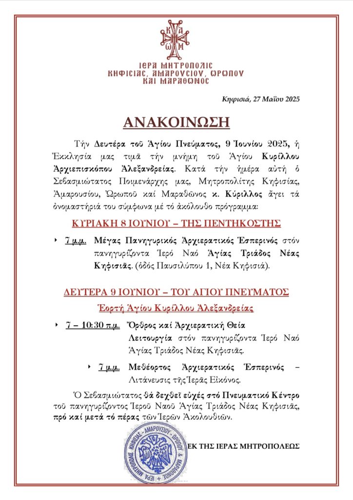 Την Δευτέρα του Αγίου Πνεύματος, 9 Ιουνίου 2025, η Εκκλησία εορτάζει τη μνήμη του Αγίου Κυρίλλου Αρχιεπισκόπου Αλεξανδρείας. Κατά την ημέρα αυτή ο Μητροπολίτης Κηφισίας, Αμαρουσίου, Ωρωπού και Μαραθώνος κ. Κύριλλος άγει τα ονομαστήριά του.