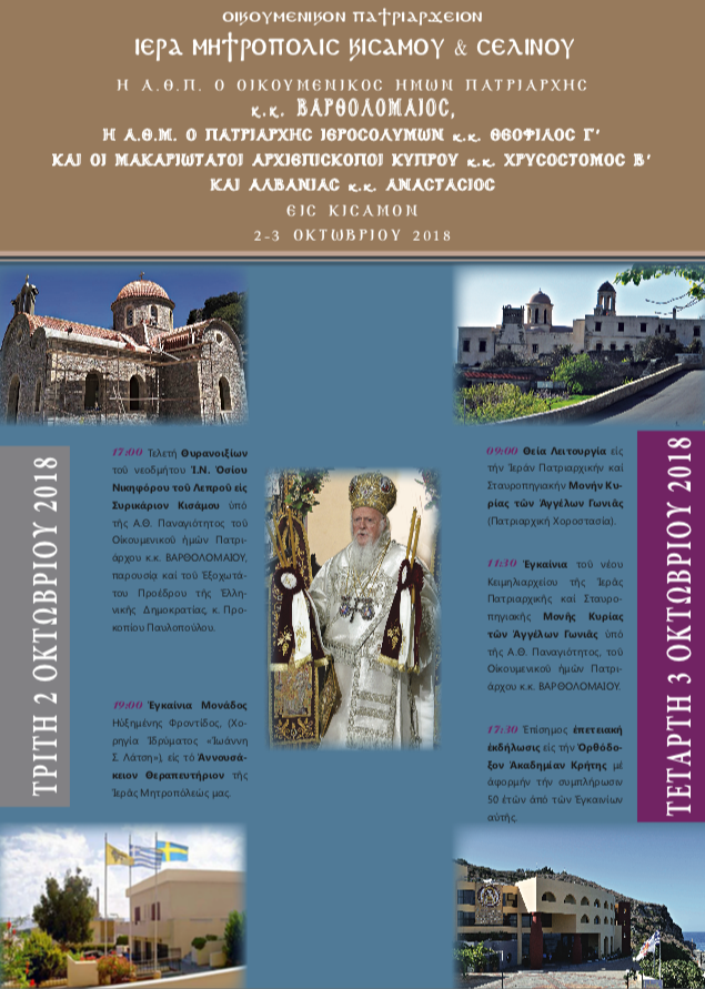 Των ως άνω εκκλησιαστικών και ιστορικών αυτών γεγονότων θα προστεί ο Παναγιώτατος Οικουμενικός Πατριάρχης κ.κ. Βαρθολομαίος, συμμετεχόντων και: του Μακαριωτάτου Πατριάρχου Ιεροσολύμων κ. Θεοφίλου, των Μακαριωτάτων Αρχιεπισκόπου Κύπρου κ. Χρυσοστόμου και Αρχιεπισκόπου Αλβανίας κ. Αναστασίου ως και της Ιεράς Επαρχιακής Συνόδου της Εκκλησίας Κρήτης.