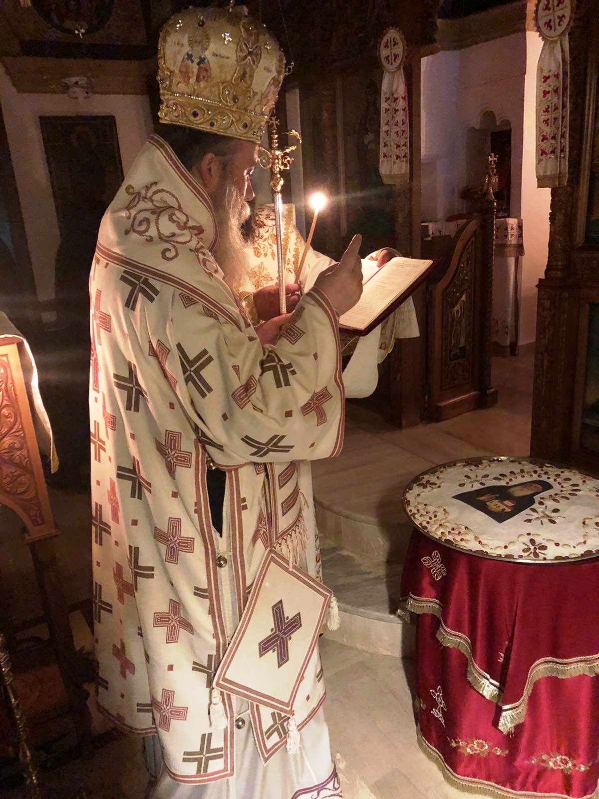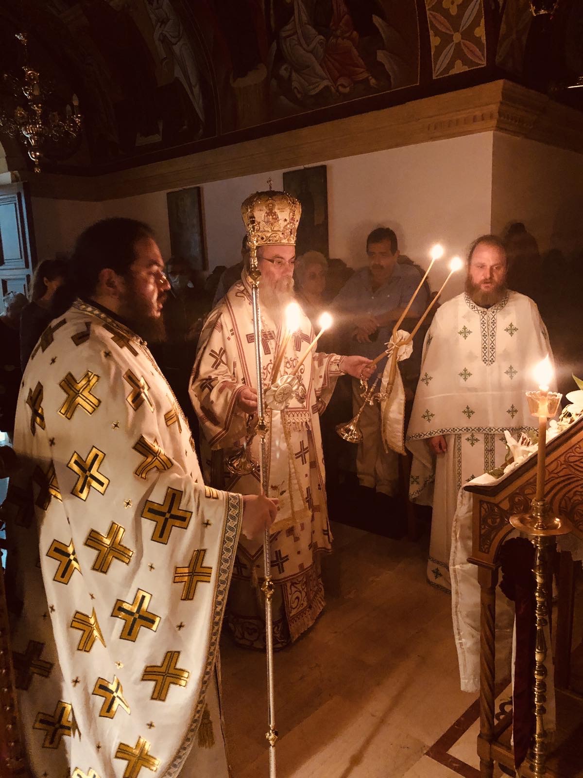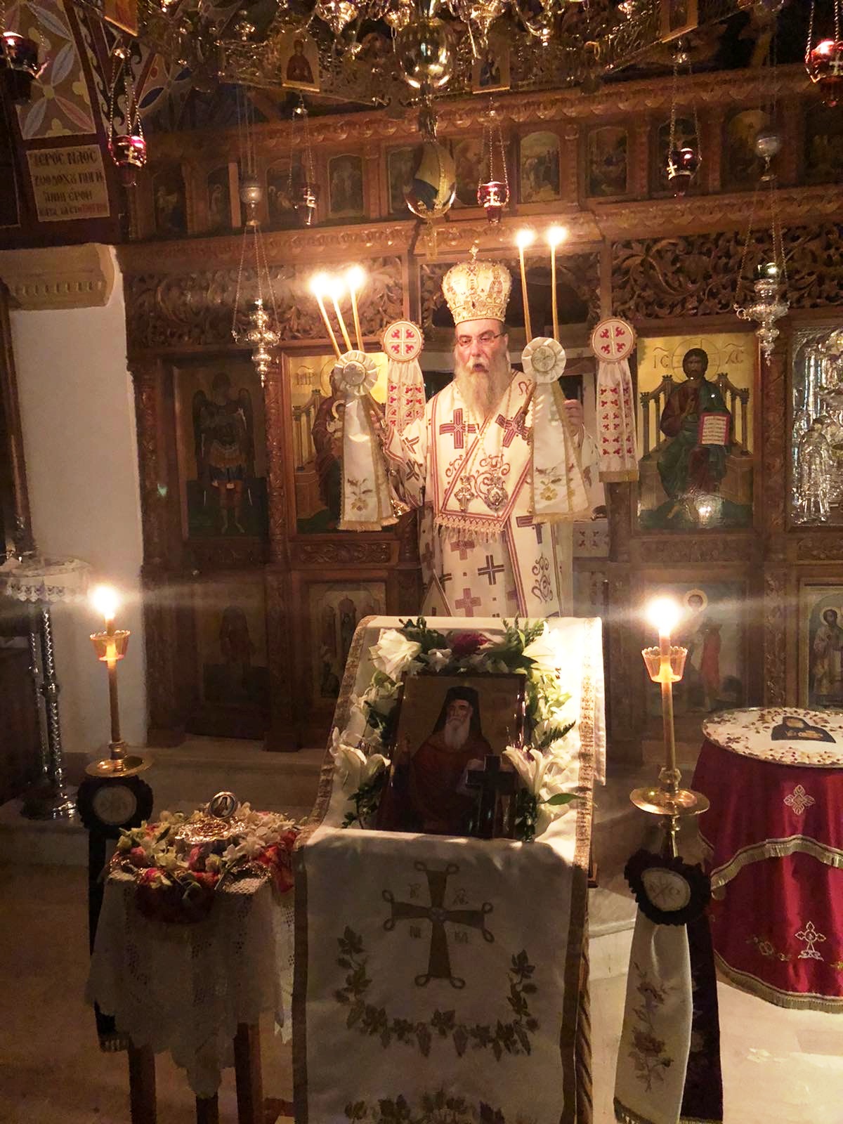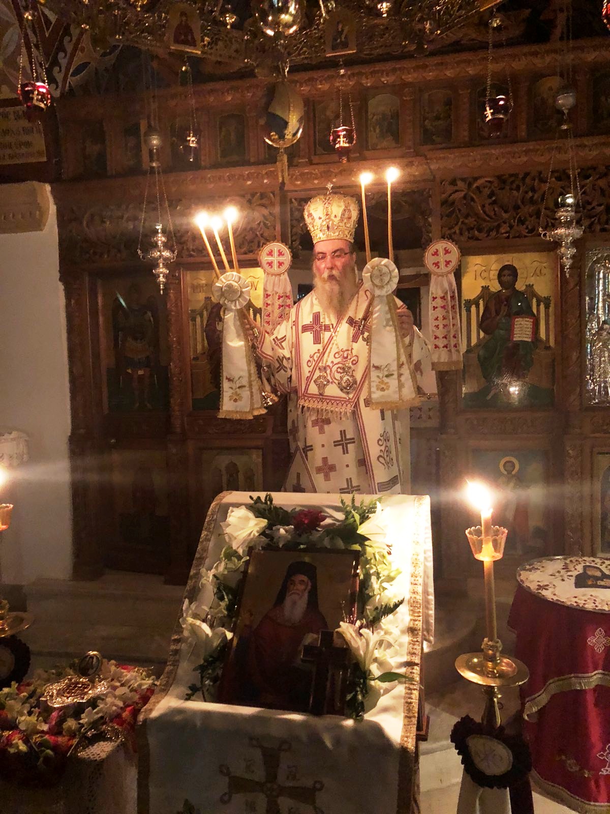 Εις τον σύντομο χαιρετισμό του ο λειτουργών Ιεράρχης αναφέρθηκε εις την οσιακή μορφή του αγίου πατρός σημειώνοντας: «Στην εποχή μας όπου, κατά το Αποστολικό, μοιάζει να πλεόνασε η αμαρτία, «υπερεπερίσσευσεν η χάρις», καθώς η αγάπη του Θεού για το δημιούργημα Του, τον άνθρωπο, ανοίγει δρόμους και χαρίζει ευκαιρίες σωτηρίας. Απόδειξις οι Άγιοι και Όσιοι των καιρών μας, οι Οποίοι πλουσίως και αρχοντικώς ανακουφίζουν, στηρίζουν, ενισχύουν και παραμυθούν πλήθος ψυχών ανά την οικουμένη. Προεξάρχων το χορού ο Όσιος πατήρ ημών Αμφιλόχιος, ο επονομαζόμενος νέος ασκητής, ο εκ Πάτμου. Δώρο Θεού η παρουσία Του. Ο Παναγιώτατος Οικουμενικός μας Πατριάρχης κ.κ. Βαρθολομαίος, ο Οποίος έχει ιδίαν πείρα εκ της συναναστορφής Του μετά του Οσίου πατρός, καθώς υπήρξε πνευματικός Του, και η περί Αυτόν Αγία και Ιερά Σύνοδος, Θεία συνάρσει, προέβησαν στην Αγιοκατάταξη του Οσίου Αμφιλοχίου του Πατμίου.