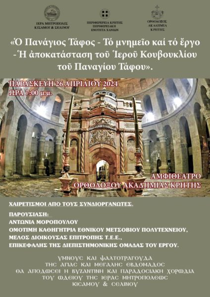 Η Ιερά Μητρόπολις Κισάμου και Σελίνου, η Περιφέρεια Κρήτης-Περιφερειακή Ενότητα Χανίων και η Ορθόδοξος Ακαδημία Κρήτης, διοργανώνουν εκδήλωση με αναφορά στον Πανάγιο Τάφο.