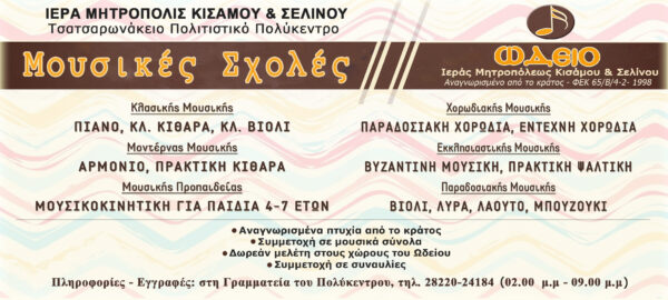 To Τσατσαρωνάκειο Πολιτιστικό Πολύκεντρο της Ι. Μητροπόλεως Κισάμου και Σελίνου ανακοίνωσε ότι άρχισαν, για το νέο Σχολικό έτος, οι εγγραφές στο Ωδείο της Μητροπόλεως, το οποίο στεγάζεται στους πλήρως εξοπλισμένους και άρτια οργανωμένους και φροντισμένους χώρους του Τσατσαρωνάκειου Πολύκεντρου. Οι Μουσικές Σχολές που θα λειτουργήσουν είναι:Σχολή Κλασικής Μουσικής: Πιάνο, Κλασική Κιθάρα, Κλασικό Βιολί, Σχολή Μοντέρνας Μουσικής: Αρμόνιο, Πρακατική Κιθάρα, Σχολή Παραδοσιακής Μουσικής: Βιολί, Λύρα, Λαούτο, Μπουζούκι, Σχολή Εκκλησιαστικής Μουσικής: Βυζαντινή Μουσική (Θεωρία)-Πρακτική, Σχολή Μουσικής Προπαιδείας: Μουσικοκινητική για παιδιά 4-7 ετών, Χορωδιακή Μουσική: Παραδοσιακή Χορωδία, Έντεχνη, Παιδική, Εφηβική.