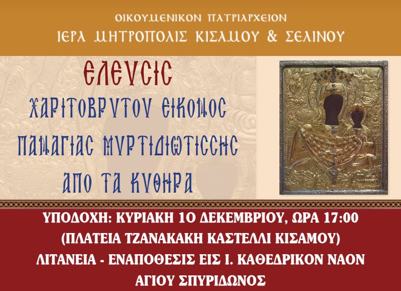 Η Ιερά Μητρόπολις Κισάμου και Σελίνου, με πνευματική χαρά και ευφροσύνη, αναγγέλλει την έλευση της Ιεράς και Χαριτοβρύτου Εικόνος της Παναγίας της Μυρτιδιώτισσας, από το ομώνυμο προσκύνημα Της, την Ιερά Μονή Παναγίας Μυρτιδιωτίσσης, των Κυθήρων.