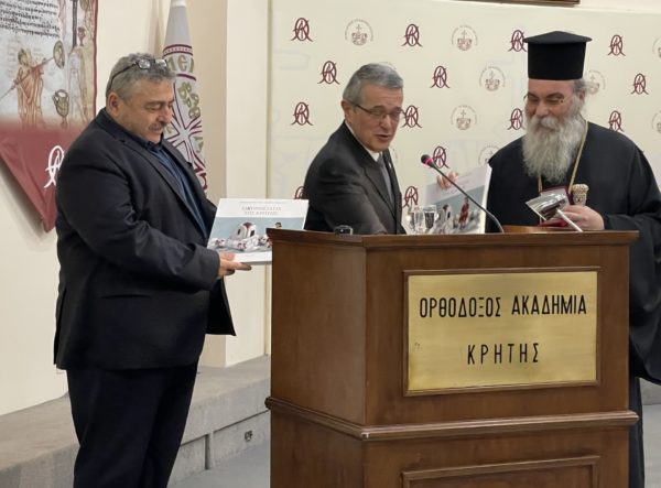 Ακολούθως στην Ορθόδοξο Ακαδημία Κρήτης, ο Γενικός Δντής Δρ. Κωνσταντίνος Ζορμπάς καλωσόρισε και συντόνισε την εόρτια εκδήλωση. Ο εκλεκτός ομιλητής Δρ. Εμμανουήλ Βαρβούνης, στην μεστή και εξαιρετική ομιλία του, αναφέρθηκε στους Αγίους Τρεις Ιεράρχες, στην διάσταση της σύνθεσης Ελληνισμού και Ορθοδοξίας στο επίπεδο της λαϊκής και της θρησκευτικής ζωής, στο ρόλο της οικογένειας ως βασικό κύτταρο της κοινωνίας, την κοινωνική ευθύνη, σημειώνοντας πως «Η ταυτότητα, η ιδιοπροσωπία του Γένους μας εδράζεται στην Ελληνορθόδοξη σύνθεση και αποτελεί το αληθινό συλλογικό μας ήθος», ευχαριστώντας «δια την τιμητική πρόσκληση».