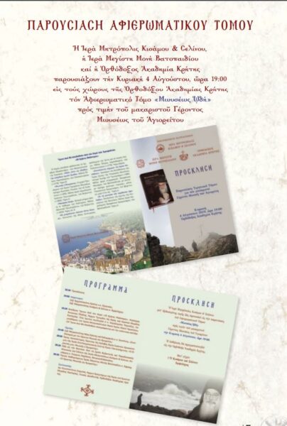 Παρουσίαση αφιερωματικού τόμου με τίτλο “Μωυσέως Ωδή”, προς τιμήν του μακαριστού Γέροντος Μωυσέως του Αγιορείτου, θα πραγματοποιηθεί την Κυριακή 4 Αυγούστου και ώρα 19:00 μ.μ. στους χώρους της Ορθοδόξου Ακαδημίας Κρήτης.