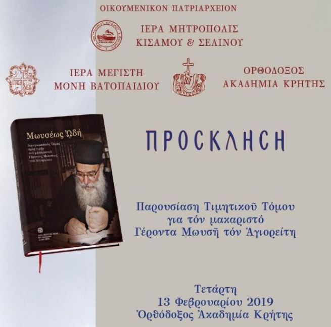 Με ιδιαίτερη χαρά η Ιερά Μητρόπολις Κισάμου και Σελίνου προσκαλεί την Τετάρτη 13 Φεβρουαρίου και ώρα 18.30μ.μ. εις του χώρους της Ορθοδόξου Ακαδημίας Κρήτης, σε πνευματική εσπερίδα αφιερωμένη εις τον μακαριστό Γέροντα Μωυσή τον Αγιορείτη, κατά την διάρκεια της οποίας θα παρουσιαστεί αφιερωματικός Τόμος, τον οποίο επιμελήθηκε και εξέδωσε η Ιερά Μεγίστη Μονή Βατοπαιδίου.