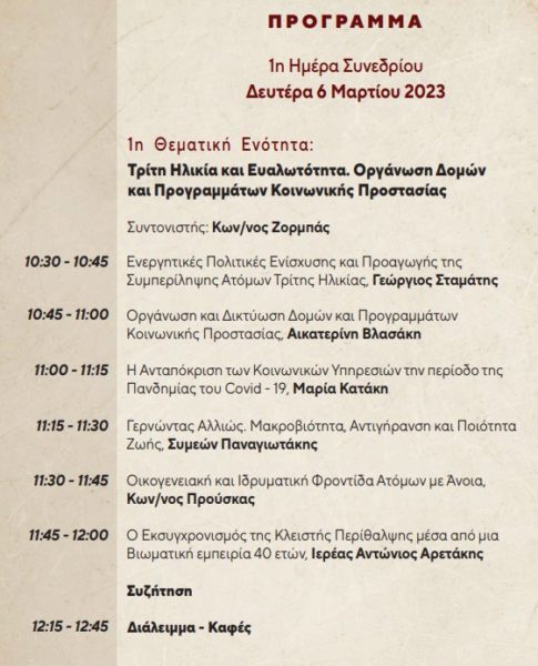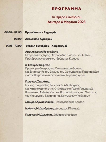 Διεπιστημονικό συνέδριο με θέμα: «Σύγχρονες τάσεις στην Κοινωνική Προστασία: Προτάσεις, Προκλήσεις και Προοπτικές» διοργανώνει η Ιερά Μητρόπολη Κισάμου και Σελίνου, τη Δευτέρα 6 και την Τρίτη 7 Μαρτίου 2023 στην Ορθόδοξο Ακαδημία Κρήτης (Κολυμπάρι, Χανίων, Κρήτης).