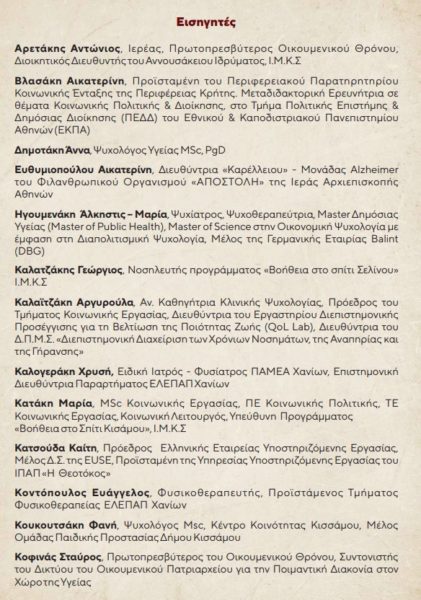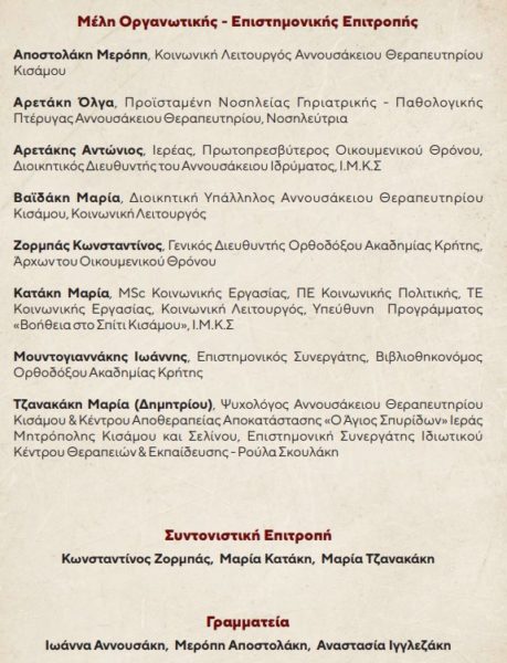 Το συνέδριο συνδιοργανώνεται με το Αννουσάκειο Θεραπευτήριο Χρονίων Παθήσεων, Κέντρο Αποθεραπείας και Αποκατάστασης Κλειστής Νοσηλείας, «Ο Άγιος Σπυρίδων» της Μητρόπολης, και η Ορθόδοξος Ακαδημία Κρήτης.