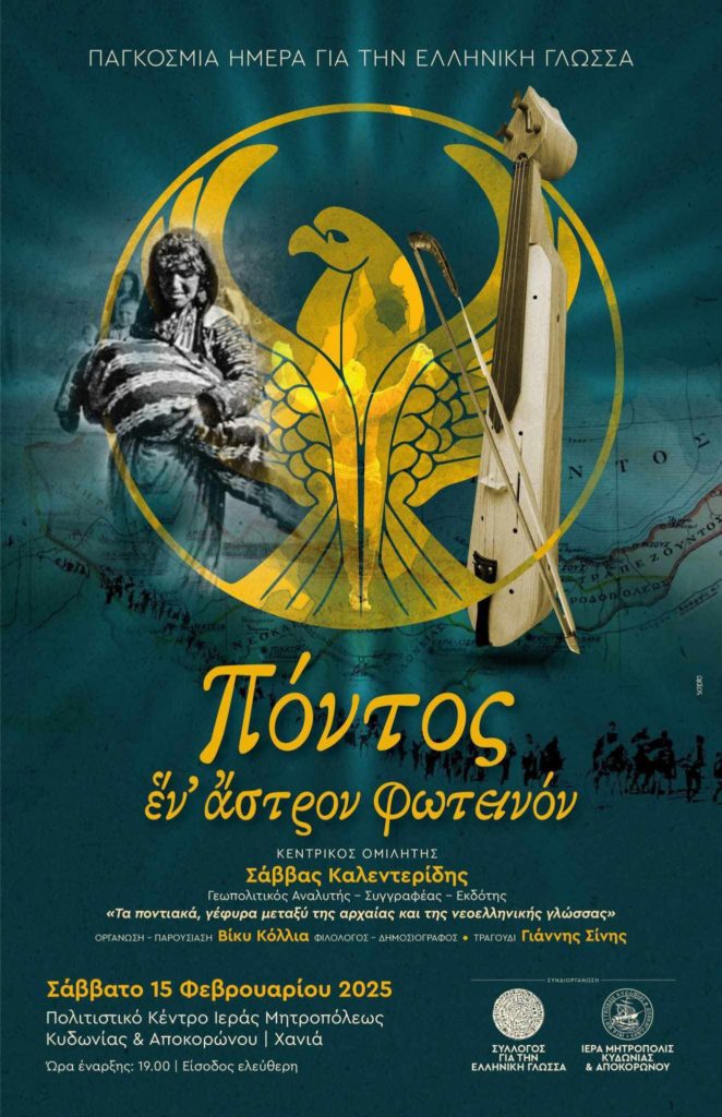 Στο πλαίσιο του ετήσιου εορτασμού της Παγκόσμιας Ημέρας για την Ελληνική Γλώσσα, η Ιερά Μητρόπολη Κυδωνίας και Αποκορώνου και ο σύλλογος για την Ελληνική Γλώσσα συνδιοργανώνουν το Σάββατο 15 Φεβρουαρίου στις 19:30 στο πολιτιστικό κέντρο της Μητροπόλεως, εκδήλωση με κεντρικό ομιλητή τον διακεκριμένο πολιτικό αναλυτή κ. Σάββα Καλεντερίδη με θέμα “Η ποντιακή διάλεκτος ως γέφυρα ανάμεσα στην αρχαία και στην νέα ελληνική γλώσσα”.