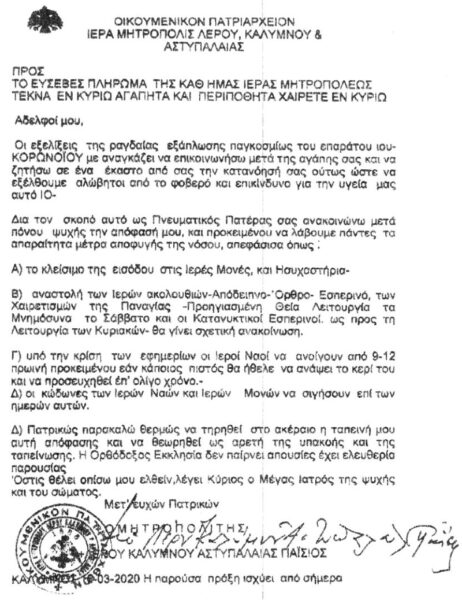 Δια τον σκοπό αυτό ως Πνευματικός Πατέρας σας ανακοινώνω μετά πόνου ψυχής την απόφασή μου, και προκειμένου να λάβουμε πάντες τα απαραίτητα μέτρα αποφυγής της νόσου, απεφάσισα όπως: