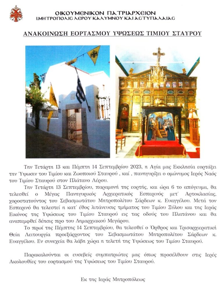 Την Τετάρτη 13 και Πέμπτη 14 Σεπτεμβρίου 2023, η Αγία μας Εκκλησία εορτάζει την Ύψωσιν του Τιμίου και Ζωοποιού Σταυρού και πανηγυρίζει ο ομώνυμος Ιερός Ναός του Τιμίου Σταυρού στον Πλάτανο Λέρου.