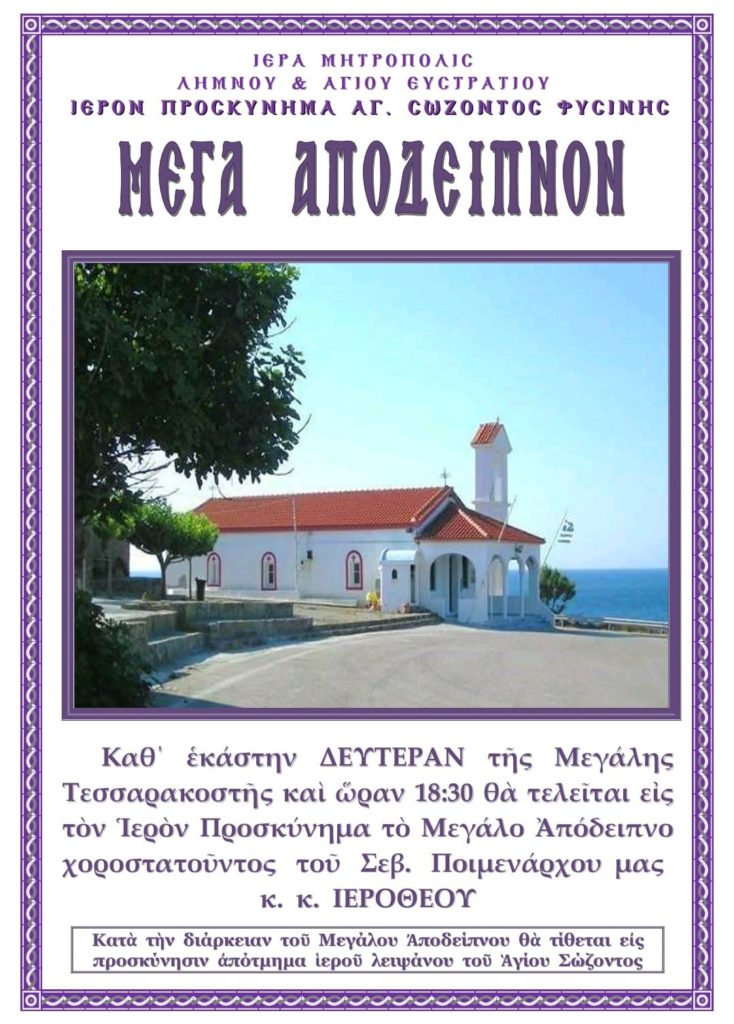 Η Ιερά Μητρόπολη Λήμνου και Αγίου Ευστρατίου ανακοινώνει ότι ο Σεβασμιώτατος Μητροπολίτης Λήμνου κ. Ιερόθεος θα χοροστατεί στο Μέγα Απόδειπνο στο Ιερό Προσκύνημα Αγίου Σώζοντος Φυσίνης, κάθε Δευτέρα της Μεγάλης Τεσσαρακοστής, στις 18:30.