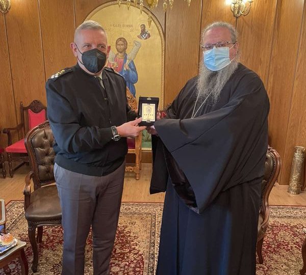Ο Σεβασμιώτατος υποδέχθηκε εγκαρδίως τον κ. Αρχηγό, τηρώντας αμφότεροι τα ασφαλή μέτρα προφύλαξης που έχει συστήσει η Ελληνική Πολιτεία, και τον ευχαρίστησε για την αμέριστη συμπαράσταση και αγάπη που επιδεικνύει στην τοπική μας Εκκλησία.