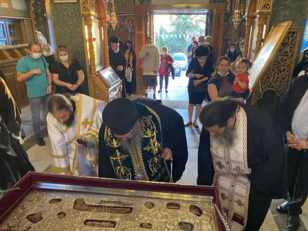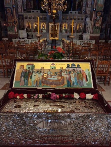 Στο εσπερινό του κήρυγμα ο Σεβασμιώτατος, ανέλυσε το θεολογικό νόημα της αγιογραφίας της Κοιμήσεως του Αγίου, η οποία κοσμεί τον Ιερό Ναό. Προ της απολύσεως ο Ποιμενάρχης άνοιξε την λάρνακα με τα Ιερά Λείψανα του Αγίου προς προσκύνηση των πιστών.