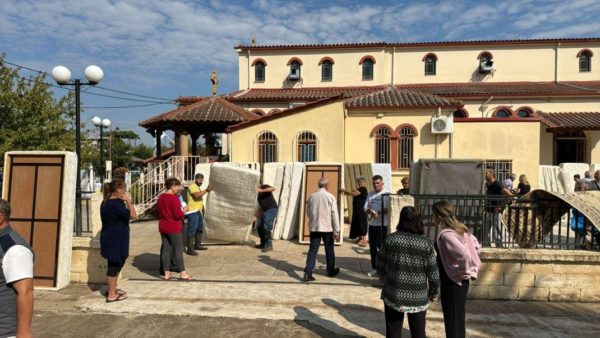 Ο π. Κωνσταντίνος Μεταλλούλης, με τους συνεργάτες του Ιερού Ναού, αφού ξεφόρτωσαν το φορτηγό, διένεμαν 34 σετ (κρεβάτι και στρώμα) σε νοικοκυριά που υπέστησαν ζημιές από τις πλημμύρες.