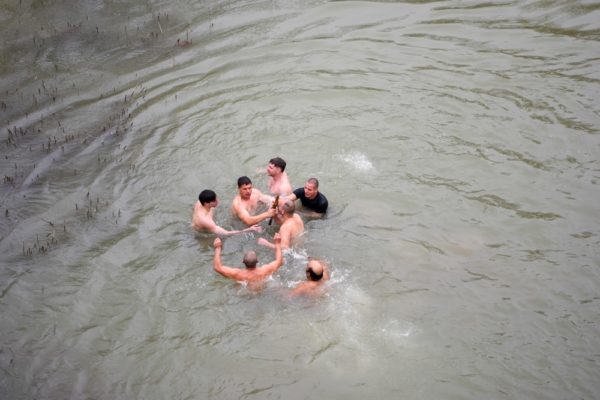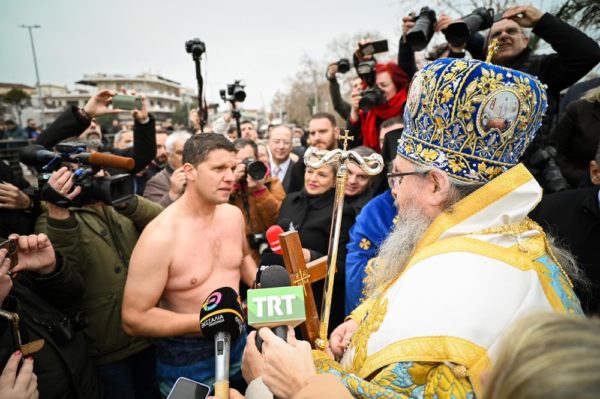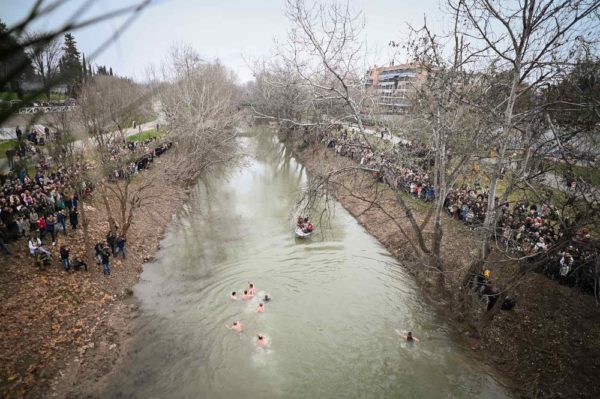Αρκετοί ήταν εκείνοι που βούτηξαν στα παγωμένα νερά του ποταμού για να λάβουν την ευλογία του Σταυρού, τον οποίο έπιασε ο 43χρονος αστυνομικός κ. Χρήστος Αϊβαλής.