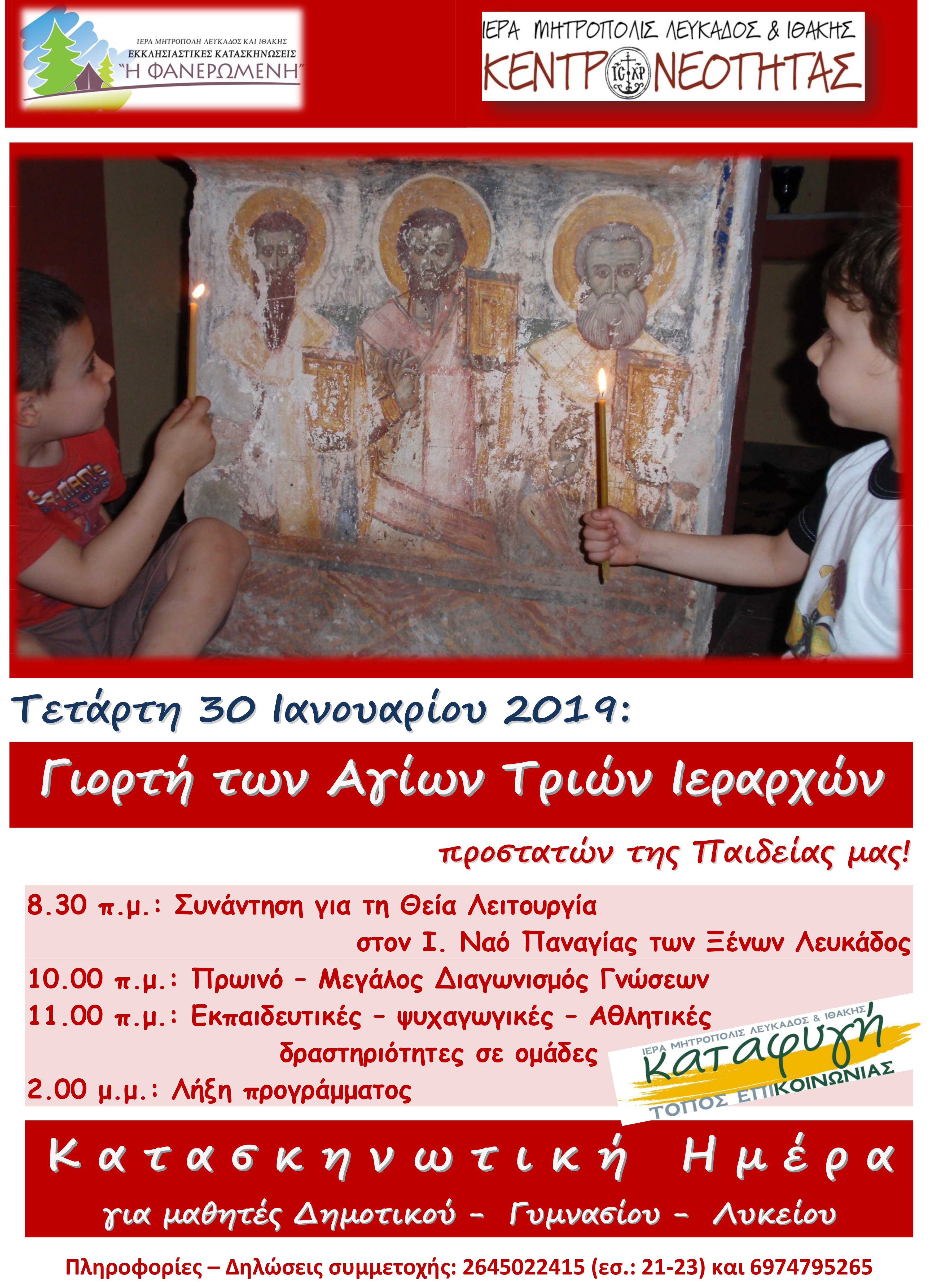 Την Τετάρτη 30 Ιανουαρίου 2019 γιορτάζουν, όπως κάθε χρόνο, οι Άγιοι Τρεις Ιεράρχες, προστάτες της Παιδείας μας. Η Πολιτεία επέλεξε να μεταβάλει φέτος τη μεγάλη γιορτή των Ελληνορθοδόξων Γραμμάτων σε αργία.