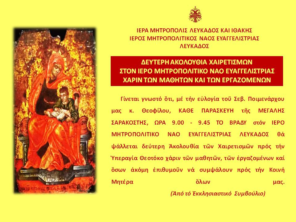 Γίνεται γνωστό ότι, με την ευλογία του Σεβ. Ποιμενάρχου κ. Θεοφίλου, ΚΑΘΕ ΠΑΡΑΣΚΕΥΗ της ΜΕΓΑΛΗΣ ΣΑΡΑΚΟΣΤΗΣ, ΩΡΑ 9.00 – 9.45 ΤΟ ΒΡΑΔΥ στον ΙΕΡΟ ΜΗΤΡΟΠΟΛΙΤΙΚΟ ΝΑΟ ΕΥΑΓΓΕΛΙΣΤΡΙΑΣ ΛΕΥΚΑΔΟΣ θα ψάλλεται δεύτερη Ακολουθία των Χαιρετισμών προς την Υπεραγία Θεοτόκο χάριν των μαθητών, των εργαζομένων και όσων ακόμη επιθυμούν να συμψάλουν προς την Κοινή Μητέρα όλων μας.