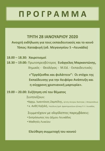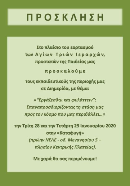 Με την ευκαιρία της εορτής των προστατών της Παιδείας μας, Αγίων Τριών Ιεραρχών το Κέντρο Νεότητας της Ιεράς Μητροπόλεώς μας και οι Διευθύνσεις Πρωτοβάθμιας και Δευτεροβάθμιας Εκπαίδευσης Λευκάδας συνδιοργανώνουν Διημερίδα, με θέμα: «”Εργάζεσθαι & φυλάττειν”: Επαναπροσδιορίζοντας τη στάση μας προς τον κόσμο που μας περιβάλλει…», την Τρίτη 28 και την Τετάρτη 29 Ιανουαρίου 2020, στον Τόπο Επικοινωνίας της Ιεράς Μητροπόλεως Λευκάδος και Ιθάκης «Καταφυγή», στην πόλη της Λευκάδας (οδ. Μεγανησίου 5 – πλησίον Κεντρικής Πλατείας, έναντι Ι. Ν. Αγ. Ιωάννου Θεολόγου), σύμφωνα με το εξής πρόγραμμα: