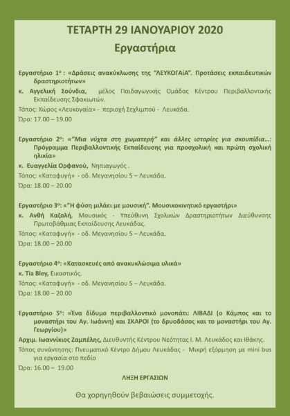 Το απόγευμα της Τετάρτης, 29 Ιανουαρίου 2020 θα διεξαχθούν τα παρακάτω εργαστήρια σε ομάδες, ως εξής: