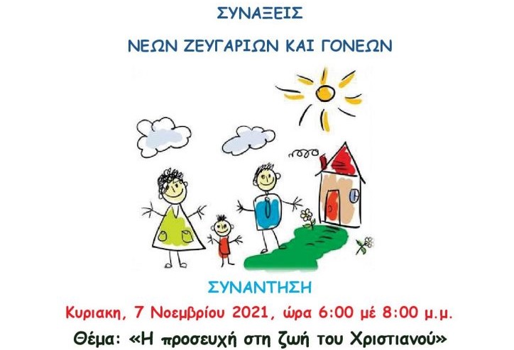 Η πρώτη συνάντηση θα γίνει την Κυριακή 7 Νοεμβρίου 2021 και 6:00μ.μ. με Θέμα “Η προσευχή στη ζωή του Χριστιανού”. Ομιλητής θα είναι ο π. Αγαθάγγελος Καμβίσης. Η συνάντηση θα πραγματοποιηθεί στο ενοριακό πνευματικό κέντρο του Ιερού Ναού των Εισοδίων Τσουκαλάδων.