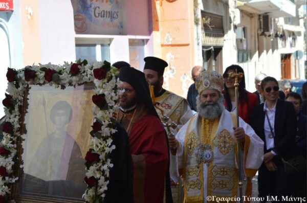 Εκκλησιαστική παράδοση αιώνων είναι η λιτανεία της εικόνας του αγίου κατά την ημέρα ή παραμονή της εορτής του χάριν ευλογίας. Έτσι και εφέτος μετά την Αρχιερατική Θεία Λειτουργία, την οποία τέλεσε ο Σεβ. Μητροπολίτου Μάνης κ. Χρυσοστόμου, έγινε η λιτανεία της εικόνας του εορτάζοντος Αγίου Γεωργίου του Τροπαιοφόρου από τον Ιερό Ναό μέχρι την κεντρική πλατεία της πόλεως.