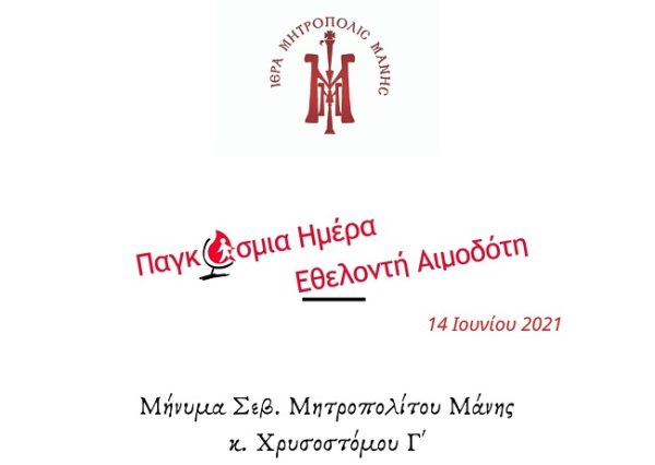 “Η αιμοδοσία είναι θεάρεστη πράξη” τονίζει ο Μητροπολίτης Μάνης κ. Χρυσόστομος στο μήνυμά του με αφορμή την Παγκόσμια Ημέρα Αιμοδότη.
