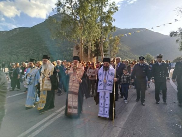 Ακολούθησε πάνδημη λιτανευτική πομπή στην πόλη του Λεωνιδίου με τη συμμετοχή των Αγίων Αρχιερέων, του ιερού κλήρου, των διακόνων, των ιεροψαλτών, των εκπροσώπων των σχολικών μονάδων και του ευσεβούς λαού, καθώς και του κ. Κωνσταντίνου Βλάση, Υφυπουργού Παιδείας και Θρησκευμάτων, του κ. Κωνσταντίνου Μανδρώνη, Αντιπεριφερειάρχη Αρκαδίας, του Δημάρχου Λεωνιδίου κ. Εμμανουήλ Δολιανίτη, του Στρατηγού της Ελληνικής Αστυνομίας Περιφέρειας Πελοποννήσου κ. Ηλία Αξιοτόπουλου, των διοικητών Πυροσβεστικής και Λιμενικού και πλήθους ευσεβών πιστών.