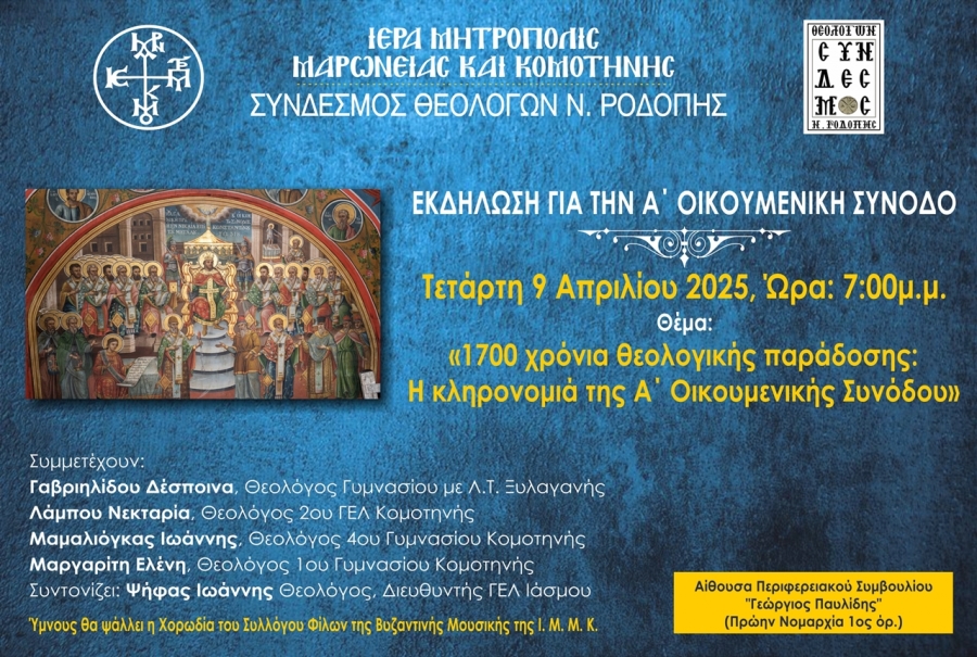 Η Ιερά Μητρόπολη Μαρωνείας και Κομοτηνής σε συνεργασία με τον Σύνδεσμο Θεολόγων Ν. Ροδόπης, πραγματοποιούν επετειακή εκδήλωση με θέμα : «1700 χρόνια θεολογικής παράδοσης : Η κληρονομιά της Α΄ Οικουμενικής Συνόδου», την Τετάρτη 9 Απριλίου 2025, και ώρα 19:00 στην αίθουσα του Περιφερειακού Συμβουλίου «Γεώργιος Παυλίδης» (πρώην Νομαρχία, 1ος όροφος) .