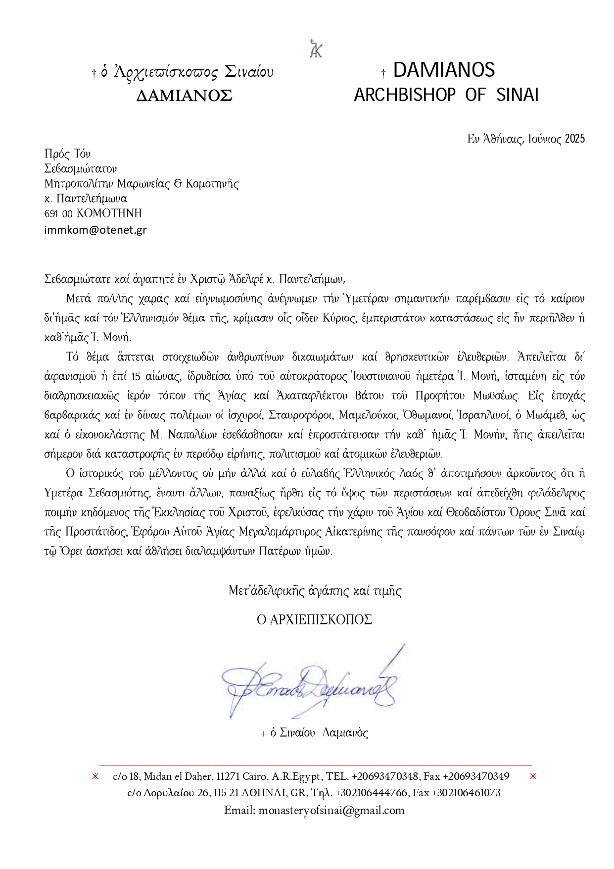 Ο Σεβασμιώτατος Αρχιεπίσκοπος Σιναίου κ. Δαμιανός απέστειλε ευχαριστήρια επιστολή προς τον Σεβασμιώτατο Μητροπολίτη Μαρωνείας και Κομοτηνής κ. Παντελεήμονα εξ αφορμής του ψηφίσματος συμπαραστάσεως των Κληρικών της Ιεράς Μητροπόλεως.