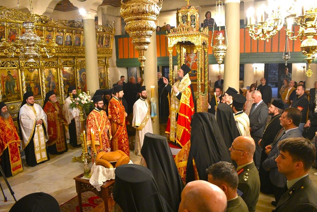 Η πομπή κατέληξε στον Ιερό Μητροπολιτικό Ναό Κοιμήσεως της Θεοτόκου, όπου τελέσθηκε Μέγας Πανηγυρικός Αρχιερατικός Εσπερινός, χοροσταντούντος του Σεβασμιωτάτου Μητροπολίτου Θεσσαλονίκης κ. Φιλοθέου και συγχοροστατούντων των Σεβασμιωτάτων Μητροπολιτών Χαλκίδος κ. Χρυσοστόμου και του Ποιμενάρχου, Μητροπολίτου Μαρωνείας και Κομοτηνής κ. Παντελεήμωνος.